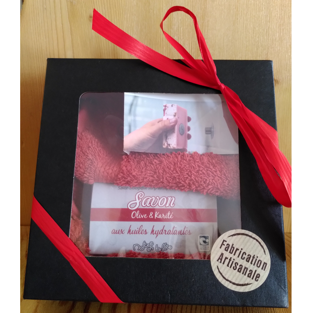 Coffret Cadeau – savon naturel, serviette d’invité et porte-savon aimanté